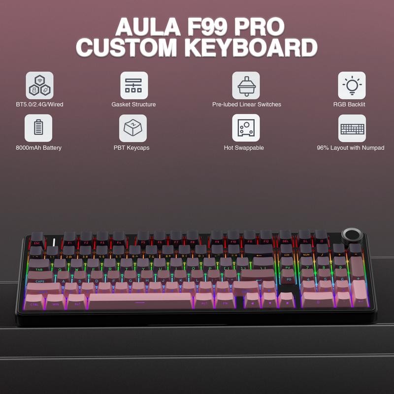 AULA F99 Pro Creamy Wireless Mechanical Gaming Keyboard with Knob Control, keyboard,Tri-Mode BT5.0/USB-C/2.4GHz Hot Swappable Custom Keyboard,Pre-lubed Linear Switches,Gasket Structure,RGB Backlit Computer Keyboards PC accessories Gradient Pink - Color: