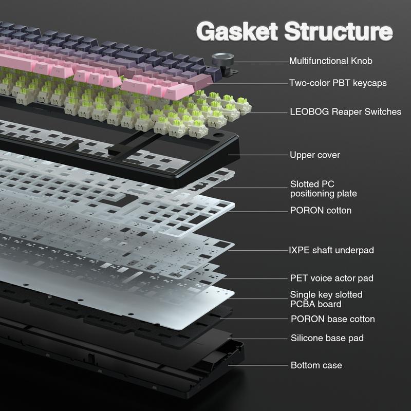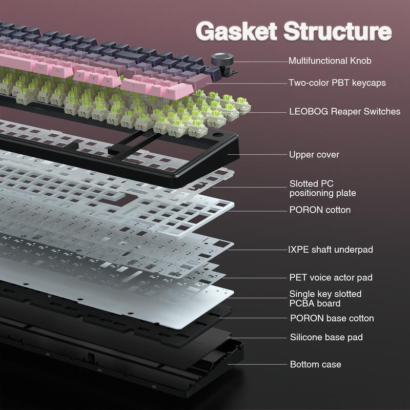 - Gasket Structure and PCB Single Key Slotting: This computer keyboard features a gasket structure, extended integrated silicone pad, and PCB single key slotting, better optimizes resilience and stability, making the hand feel softer and more elastic. Five layers of filling silencer fills the gap between the PCB, the positioning plate and the shaft,effectively counteracting the cavity noise sound of the shaft hitting the positioning plate, and providing a solid feel
