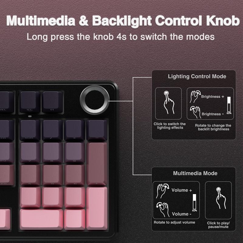 - Multi-function Control Knob: This AULA 96% wireless gaming keyboard is equipped with functional knob to switch backlit mode or multimedia mode. In backlit mode, you can rotate the knob to adjust the brightness of the lights, and click the knob to switch the lighting effects easily; in multimedia mode, rotate the knob to adjust the volume, and click the knob to play or pause. Long press the knob for about 5 seconds to switch modes
