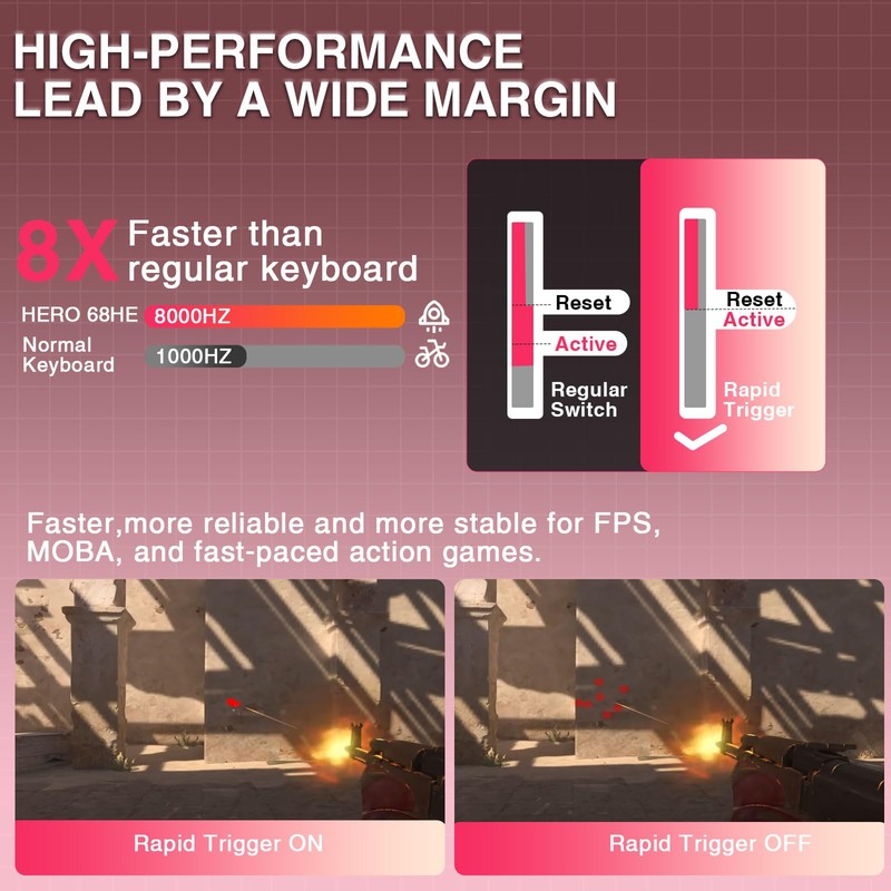 - Hall Effect Magnetic Switch & Ultra-fast Response: Equipped with hall effect magnetic switches, the AULA HERO 68HE gaming keyboard has an ultra-fast 8K polling rate and ultra-low latency of 0.125ms to keep you ahead of the competition. Featuring premium construction and advanced magnetic switch technology, this hall effect keyboard ensures flexibility and superb response, perfect for FPS and other rhythm games