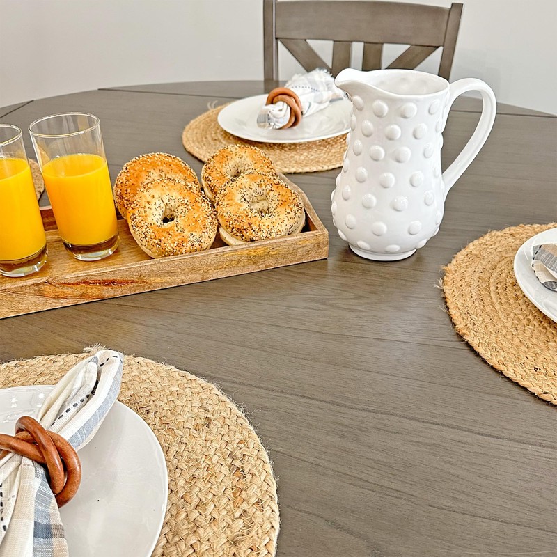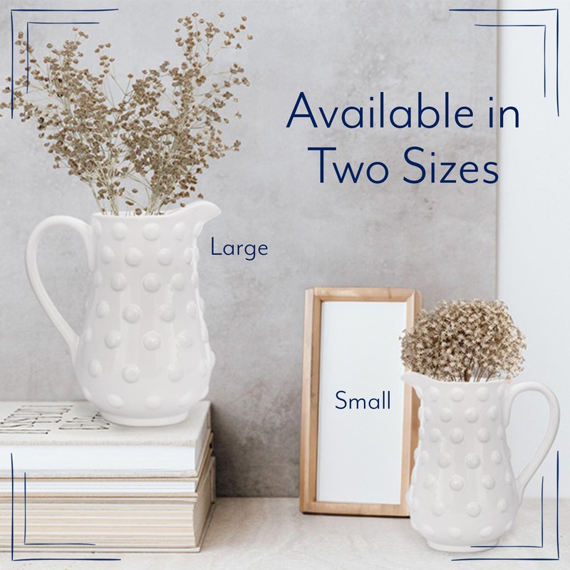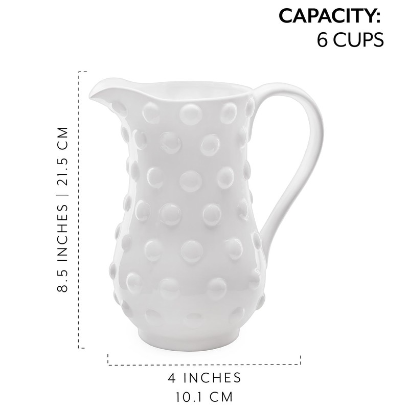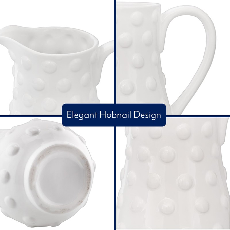 This hobnail pitcher, with retro hobnail “polka dot” finish, exudes a rustic farmhouse vibe in crisp white. It's crafted to be both a statement piece and a practical vessel for your country kitchen, fitting perfectly into the warm, casual aesthetics of farmhouse decor. Its sturdy handle curves gracefully, designed for a comfortable grip when pouring your homemade refreshments.