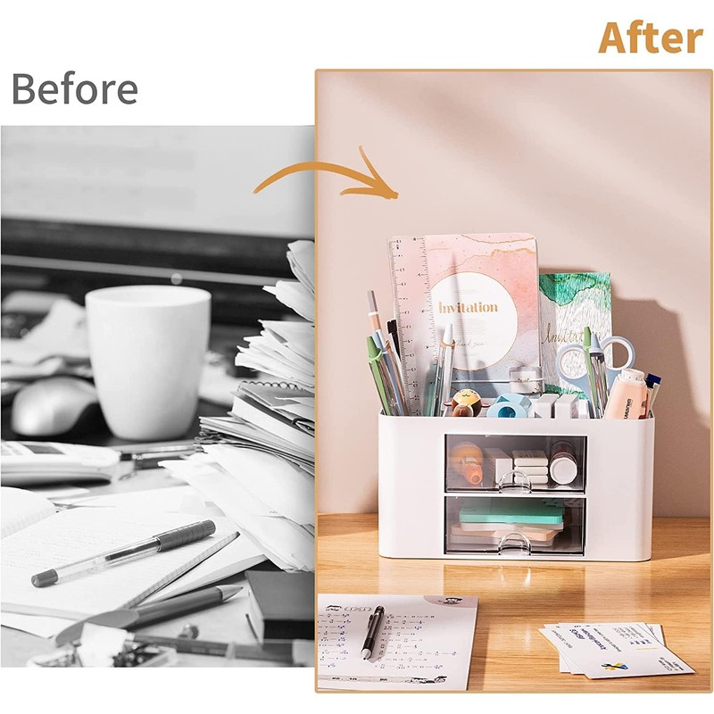 - ✏️【Enough Capacity】Set of 3 compartments pen holder, 1 top tray, 1 notebook holder, and 2 drawers which have enough storage to allow for office supplies organization. Large capacity, multifunction help you arrange the desk accessories and stationaries clean and tidy.The best and safest storage option for you. Perfect Size:7.6*5.5* 3.9inch.
