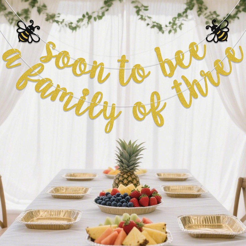 Aumccxz Soon to Bee a Family of Three Banner - Gender Reveal Baby Shower Bee Themed Party Decorations - Mommy to Bee Welcome Baby Party Decor Sign Gold & Black