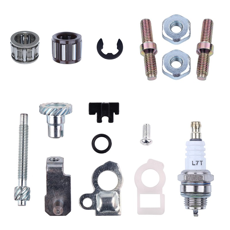 - Package include : 1 x Chain Adjuster Tensioner, 2 x Bar Stud, 2 x Bar Nut, 1 x Clutch Needle Bearing, 1 x Piston Needle Bearing, 1 x Spark Plug, 1 x E-clip