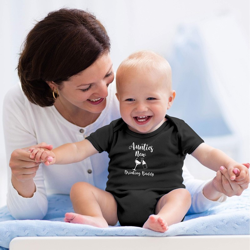 - ★★★★★ A cute addition to your baby's wardrobe! Dress up your little bundle of joy in this super adorable baby bodysuit featuring Auntie's Drinking Buddy print at the front. This little romper by Witty Fashions is cute for babies, but even funnier for adults who get the joke. This hilarious design will have all your friends and family laughing at your next special occasion. The babies might have no idea what is printed on their romper, but if they did, rest assured they would love it.