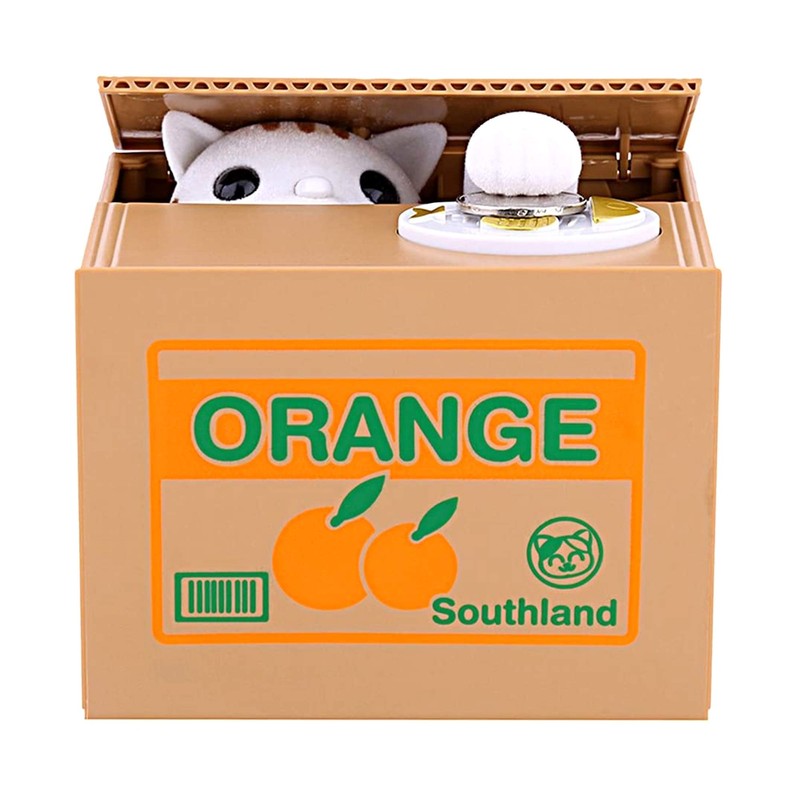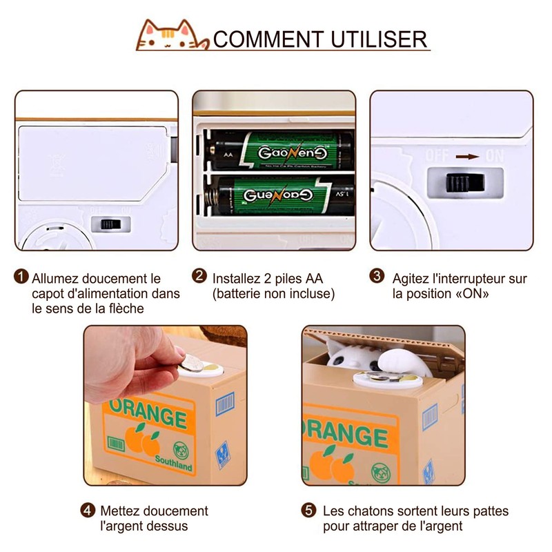 - 2. Einfach zu bedienen, installieren Sie die Batterien, schalten Sie die Mnze ein, legen Sie sie in die weie Taste und drcken Sie darber. Die orange weie Katze in der Box ffnet automatisch den Deckel und fngt die Mnze auf. Wenn es voll ist, entfernen Sie einfach die untere Kappe und Sie knnen Ihre Mnzen entnehmen.