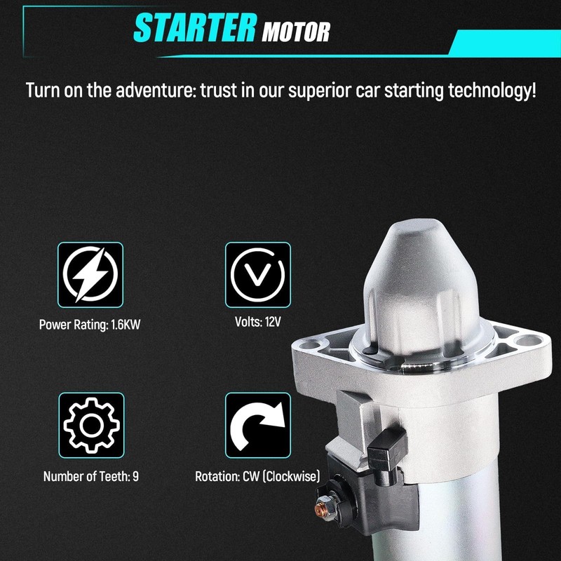 - Specifications and Packaging: ① Rated power: 1.6KW; ② Voltage: 12V; ③ Number of teeth: 9; ④ Rotation: CW (clockwise); ⑤ Packing quantity: 1x starter motor; ⑥ Packing type: boxed