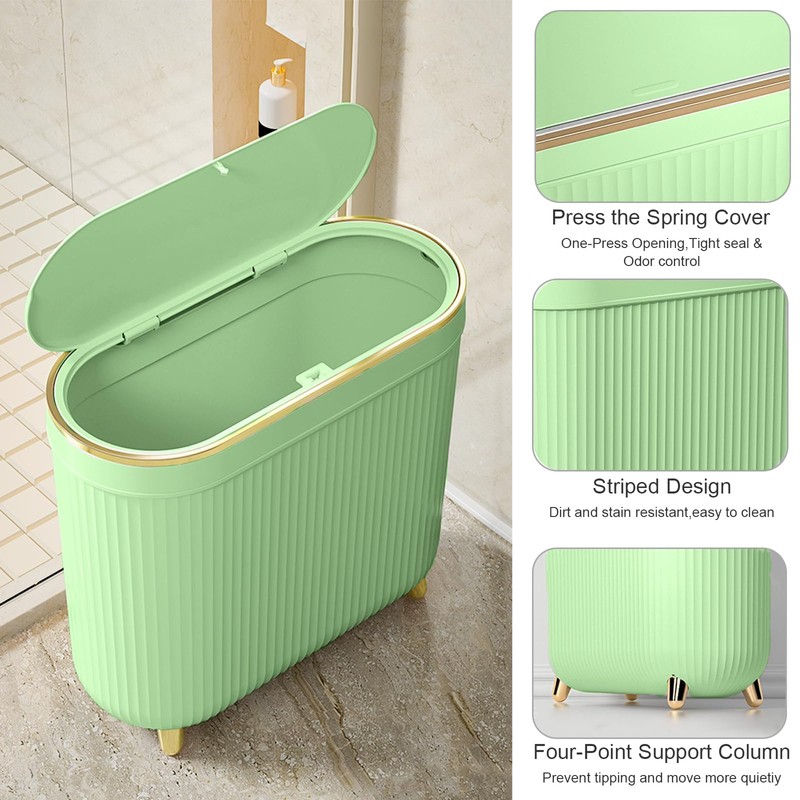 - Space Saving: The slim trash can with a width of 14 cm is very suitable for small areas such as narrow hallways, tight corners and between furniture, etc, which can help you to save room space. This waste basket is not only good for keeping your home clean and free of clutter, but also an exquisite decor for your house.
