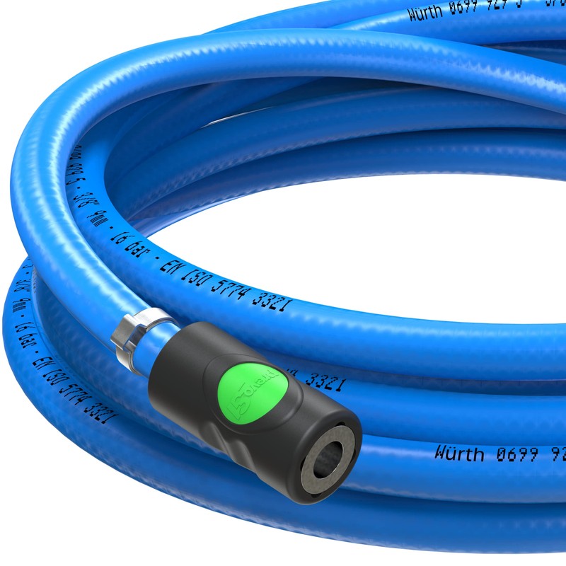 The Würth safety compressed air hose is very light, extremely stable, highly flexible, shockproof, non-slip, oil and petrol resistant as well as UV resistant.