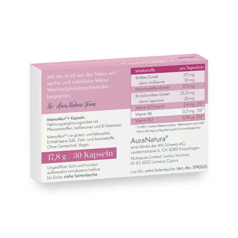 Aura Natura MenoAKUT Plus - Menopause Capsules with Red Clover, Monk Pepper, Fenugreek Enriched with Vitamins B3, B6 and B12 - Menopause Capsules - 30 Vegan Capsules - 1 Month Supply