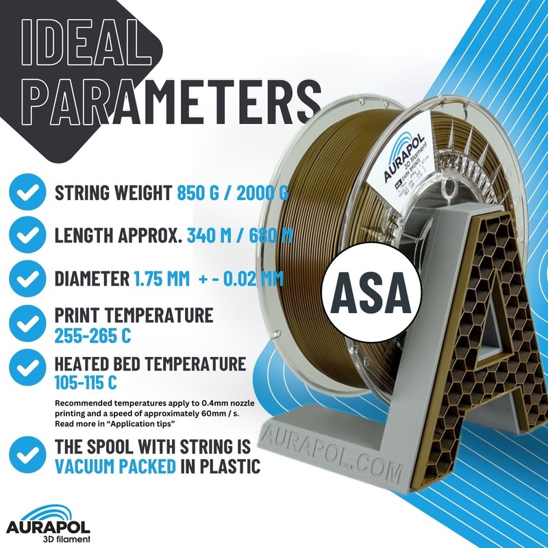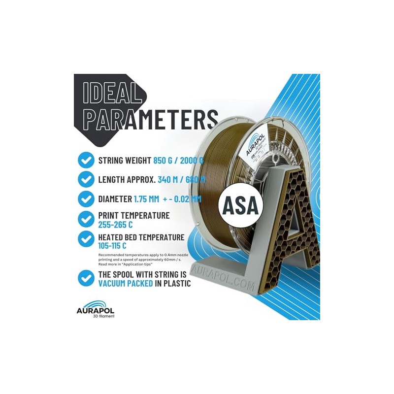 • ASA is almost like ABS, but is easier to print due to lower shrinkage. Can be smoothed with acetone steam. Silk matte surface, durable and resistant. Perfect bonding of the layers. Beautiful prints. Must be stored and printed well dried. The diameter tolerance is +/- 0.02 mm. Precise ovality guarantees excellent printing results. Easy and reliable printing