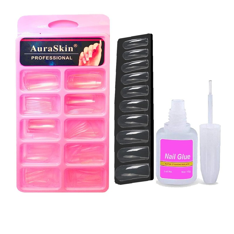AuraSkin Gorgeous 100pcs Reuseable Acrylic Transparent Artificial Nail Tips Best False Nails with 10ml Strong Nail Glue Transparent (Pack of 100)