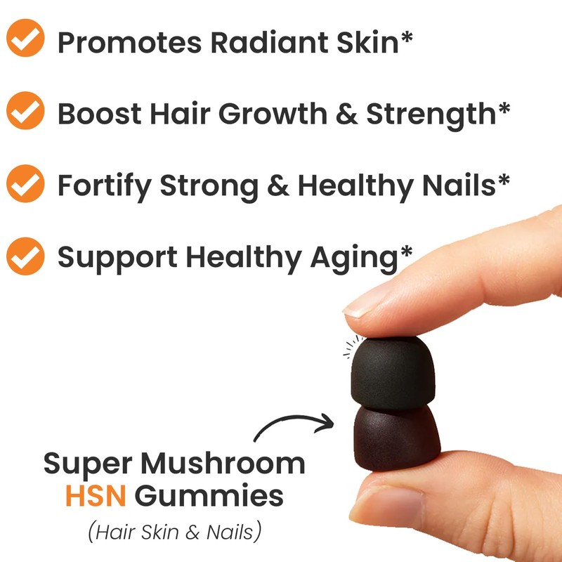 - NATURAL BEAUTY & WELLNESS - Super Mushroom Hair, Skin & Nails Gummies feature a potent mix of mushroom extracts. Experience Beauty Gummies that nurture lustrous hair, radiant skin, & resilient nails.