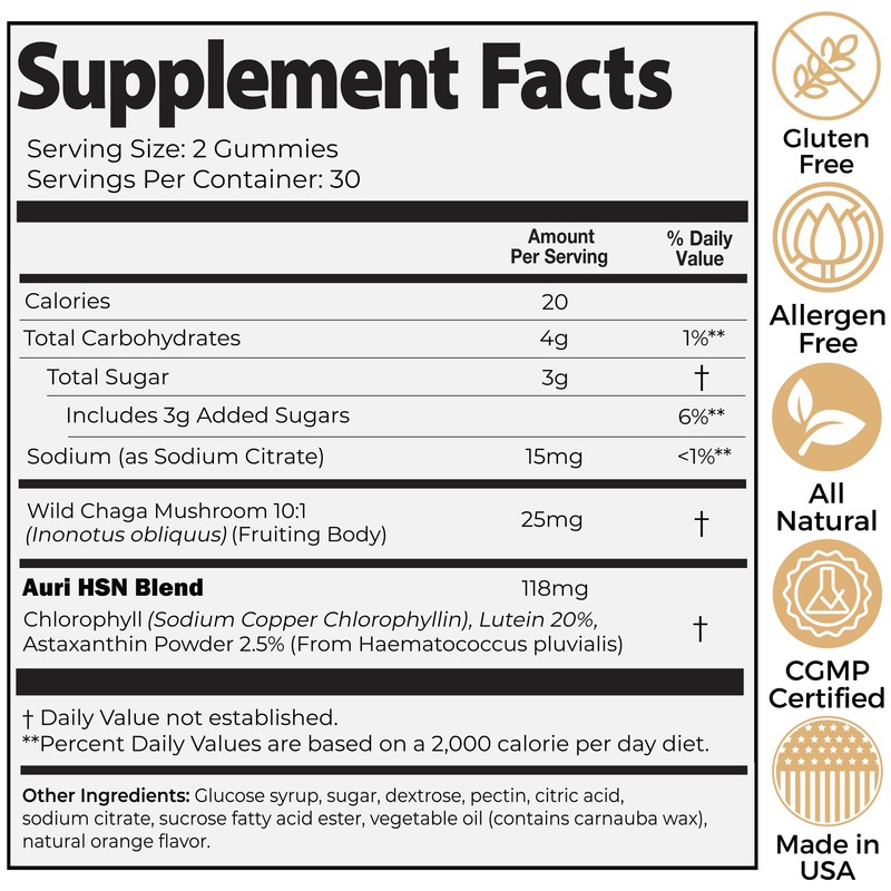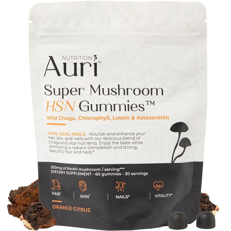 Auri Super Mushroom HSN Gummies - Hair Skin and Nails Gummies Functional Mushrooms Supplement - with Wild Chaga, Chlorophyll, Lutein and Astaxanthin - 60 Orange Citrus Gummies