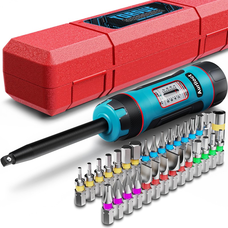 Aurlloct MicroClick Torque Screwdriver Extra Long Style 1/4 Inch 1-8 Nm with Interchangeable Bits for Bicycle Repair, 32 Pieces