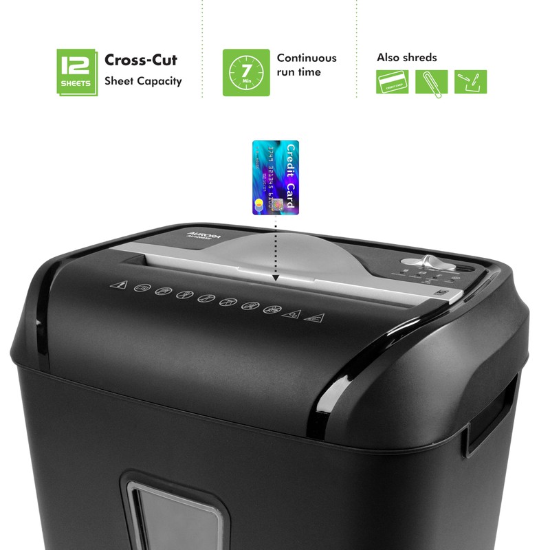 - Crosscut with 12 sheet capacities; shreds credit cards and small paper clips.