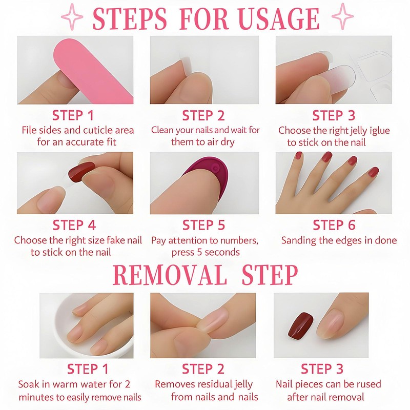 - ✨[Quick Application] Achieve salon-nice nails in minutes with these easy-to-apply stick on nails. Simply prep, align and press for instant gorgeous results. The included jelly adhesive tabs ensures long-lasting wear while allowing damage-free removal when desired.