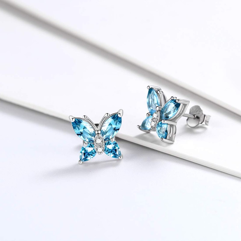 Aurora Tears Butterfly Necklace Earrings Rings Birthstone Jewellery Set Pendant Dating Pendant Gifts for Women and Girls 925 Sterling Silver, Earrings, C.blue-aquamarine