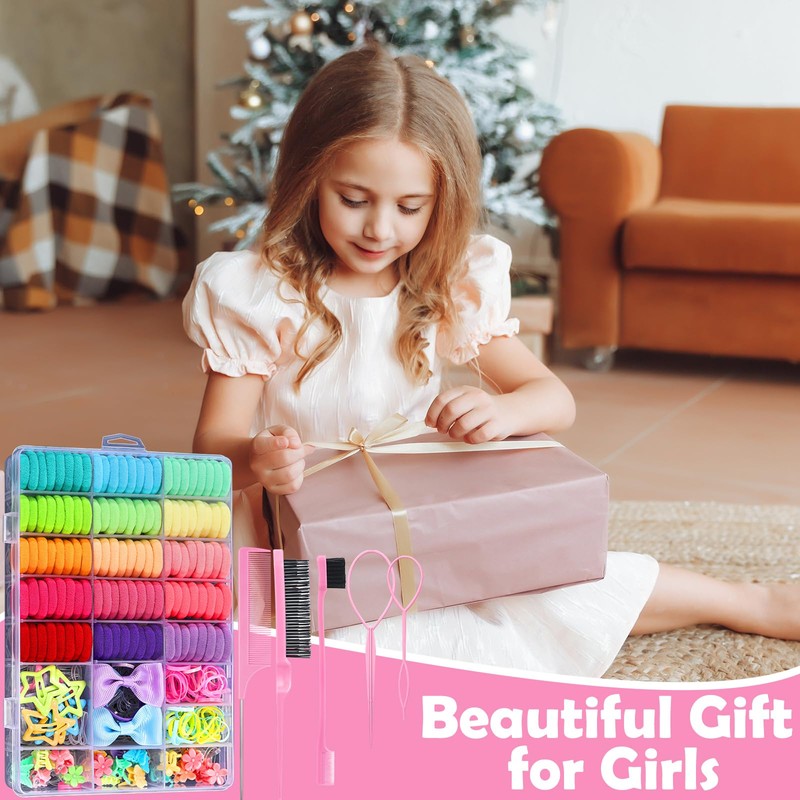 - 【Rich Combination】The girls hair accessories set includes 300 cotton toddler hair ties, 200 hair rubber bands, 100 baby hair ties, 40 baby hair clips, 4 baby hair ties with bows, 2 hair tail tools, 1 teasing hair brush, 1 double sided edge brush and 1 rat tail comb. Packaged in a reusable transparent plastic box