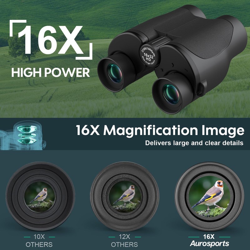 Aurosports Aurosports 16x32 Compact Binoculars for Adults and Kids - High Powered Small Binoculars with Low Light Vision - Easy Focus Lightweight Binoculars for Bird Watching Hunting Travel Hiking