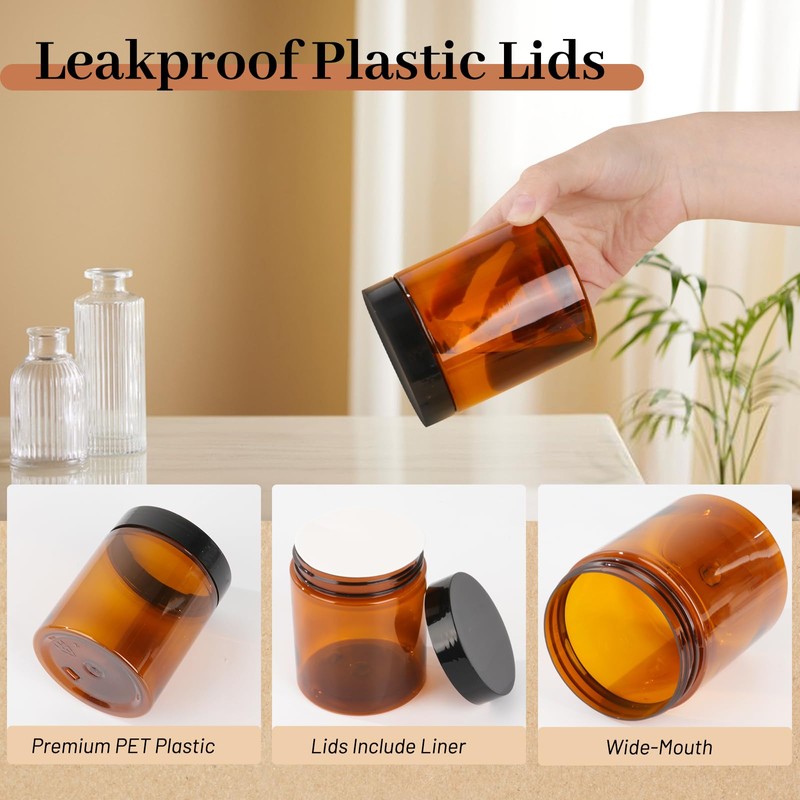 - LOCK FRESHNESS & LEAK-PROOF: Tight-sealing lids on 8oz amber plastic jars with lids lock in freshness, preventing leaks even when jostled in bags or luggage, ensuring your skincare stays intact whether at home or on the go