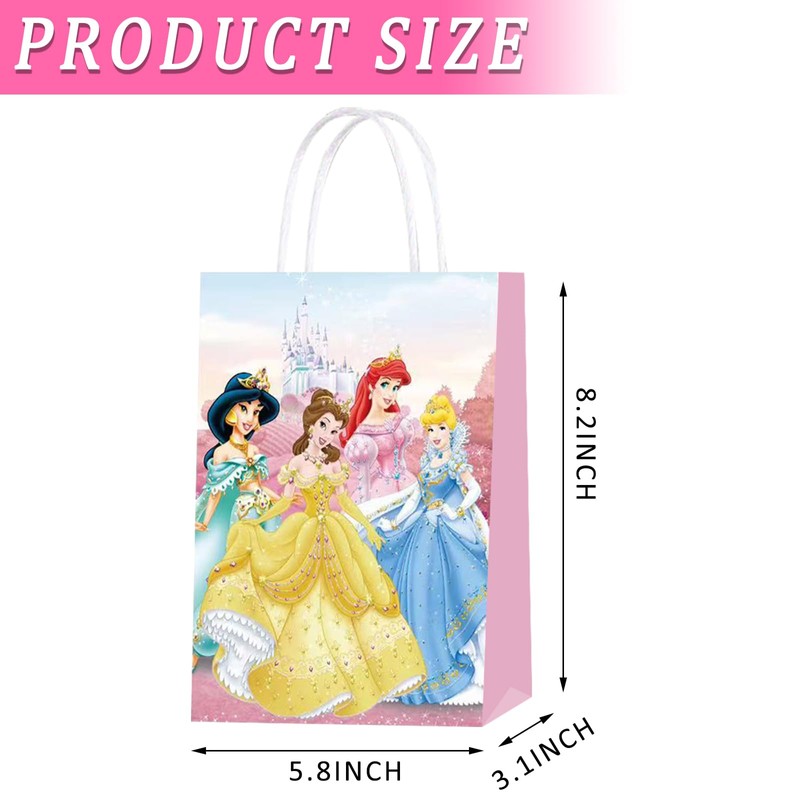 - Perfect Birthday Party Supplies: Each princess party favor bag size approx. 15 x 8 x 21cm / 5.9 x 3.1 x 8.2 inches (L x W x H), not include the height of handle, great for containing snacks, candies, biscuits, cookies, chocolates, small gifts. These bags are full of princess elements, exquisite and cute, ideal birthday party decorations for kids.