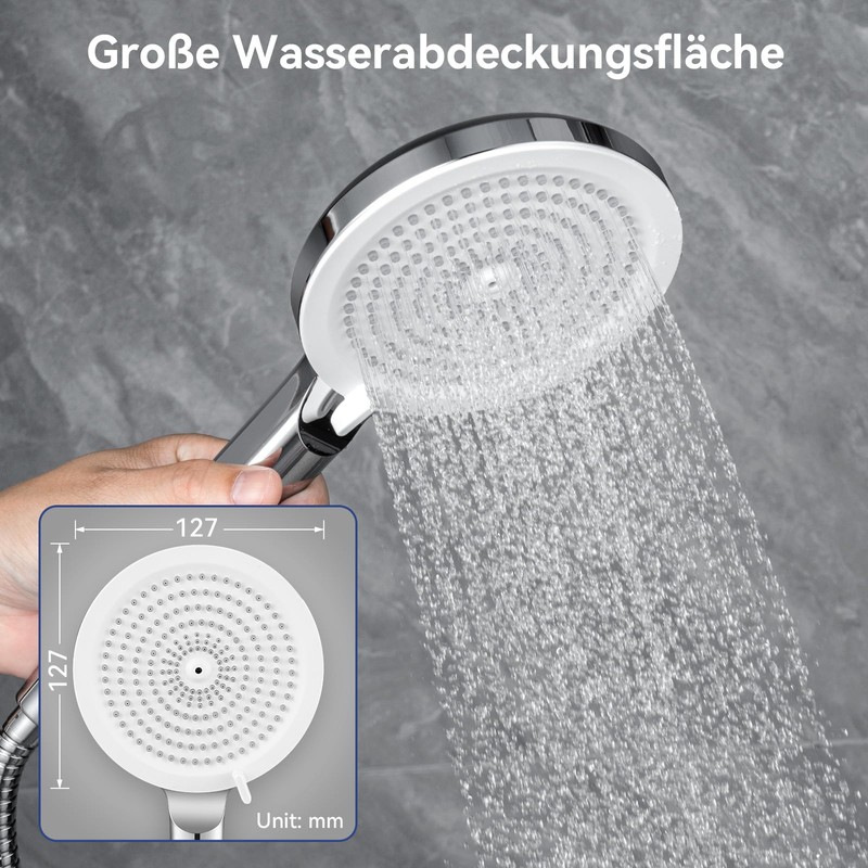 - Large shower head - Full coverage: With a 127 mm head and tightly set silicone nozzles, this shower head covers a wide area. The anti-limescale feature extends the life and ensures even water flow - the upgrade for your daily shower.