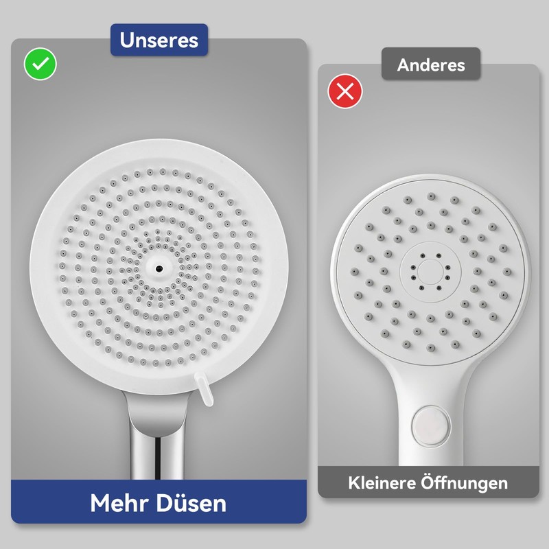 - High pressure and water-saving: the innovative high pressure shower head with compressed TPE outlet structure ensures strong water flow with reduced consumption. Enjoy a powerful shower experience with our water-saving shower head - ideal even at low water pressure.
