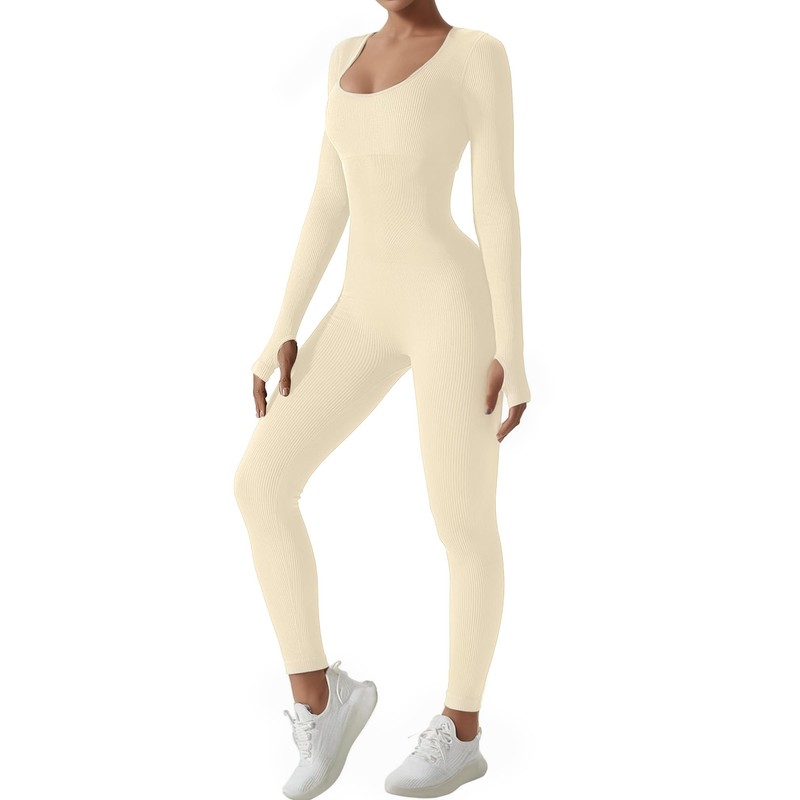 AURUZA Jumpsuits for Women Long Sleeve One Piece Jumpsuits for Women Jumpsuits Yoga Workout Seamless Jumpsuits Rompers Ribbed Exercise Tummy Control Romper square Neck Leggings Romper,White,M