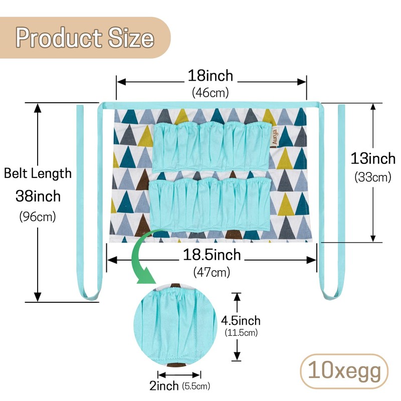 • 📏Dimensions: The full size of a child's egg gathering apron is 18 inches wide×13 inches height with 38 inches long tie on each side. There are a total of 10 deep pockets to holding eggs. The capacity of the egg apron is 10-20 eggs.