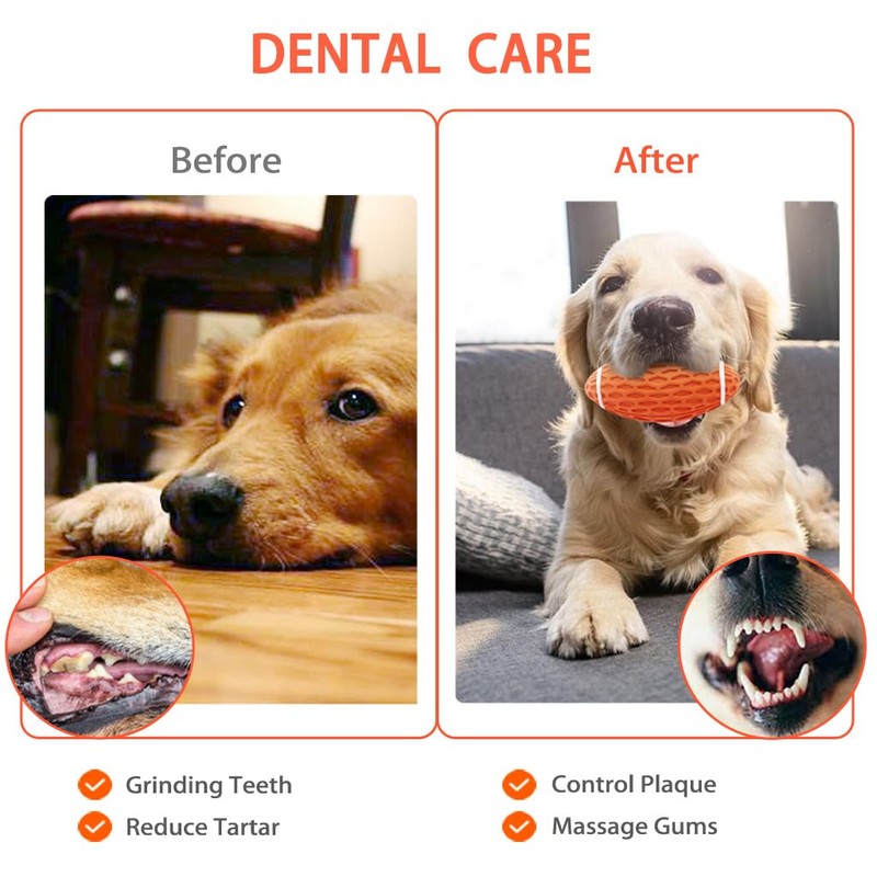 - 🐕【Attractive Design with Squeaker】Featuring a classic football design and give your dog the ultimate chewing experience. Its grooved surface allows for easy gripping and quick biting. Plus, its built-in sound device makes squeaky sound which is irresistible to dogs.