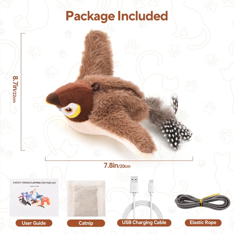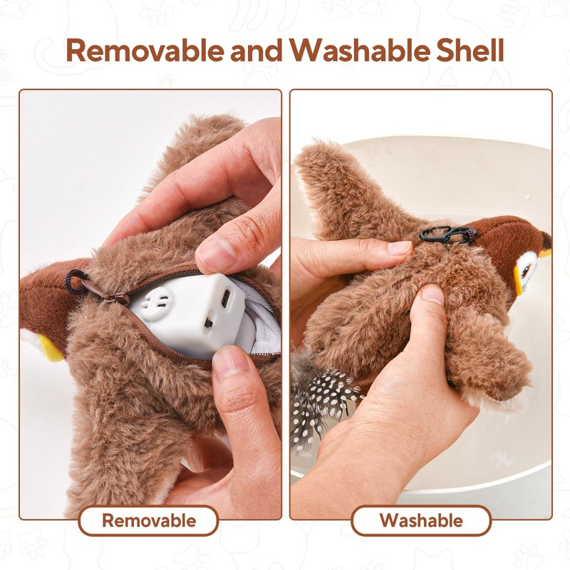 - 【Safe Material & Easy to Clean】: Crafted with soft, durable plush and multi-textured feathers, the flapping bird toy for cats withstands rough play while being gentle on paws, and the reinforced stitching ensures long-lasting use for daily interactive play. The fully detachable mechanism enables you easily remove and wipe down the plush body, making it convenient to clean.