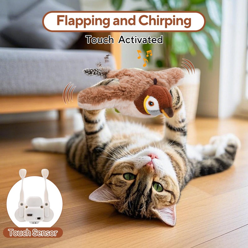 - 【Interactive Flapping Bird Cat Toy】: A electric bird cat toy with a built-in touch motion sensor. When your cat taps it, the chirping cat bird toy will automatically flap and make a bird sound, attracting your cat to play. You can also use the equipped hook and elastic rope to hang the cat toy bird to effectively captivate your furly friend, relieve their boredom and loneliness.(Note: This is a flapping toy that stays on the ground, not a flying toy.)