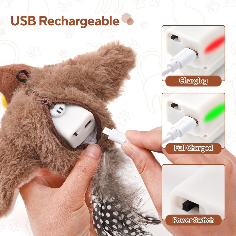 - 【USB Rechargeable】: Our flapping bird cat toy features a built-in rechargeable battery charges via the included USB cable (LED turns green when fully charged). Charges fully in just 1 hour and delivers 280 exciting movement cycles per charge. For optimal performance, make sure to fully charge your new cat bird toy and turn the switch to ON side before playtime.