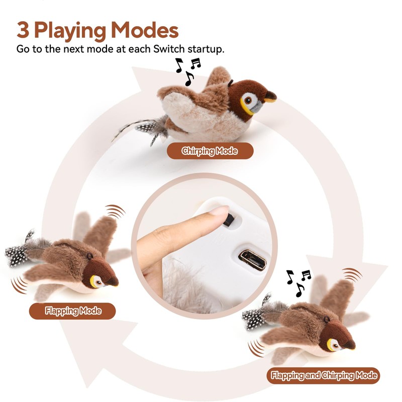 - 【Three Flapping Modes】: Our bird cat toy offers common, intermittent, and fast flapping modes that cycle automatically. After starting, the toy flaps for about 17 seconds before entering a short sleep mode—the next time it activates, it switches to the next mode, creating a dynamic and engaging experience for your cat. If left untouched for a while, the toy will go into sleep mode to save energy. This cat bird toy can make your cats feel like they're interacting with a real bird! It’s perfect for satisfying their natural hunting instincts and keeping them entertained for hours.