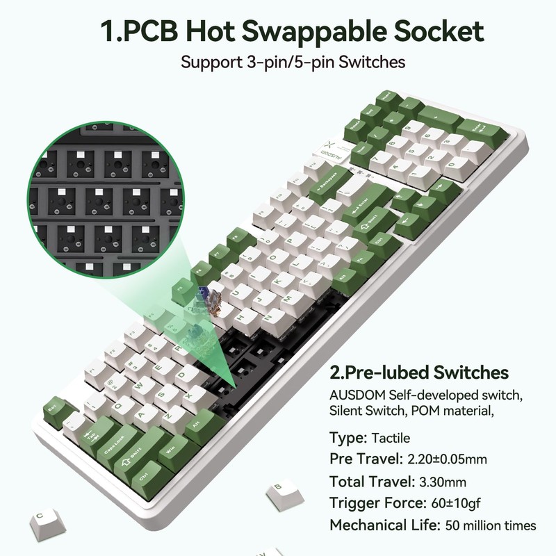 - Pre-lubed Silent Tactile Switches: This wireless keyboard uses AUSDOM's self-developed silent tactile switches for a truly silent office. With clear press feeling and quiet typing environment, AUSDOM 98Pro silent mechanical keyboard is a good partner for your office.