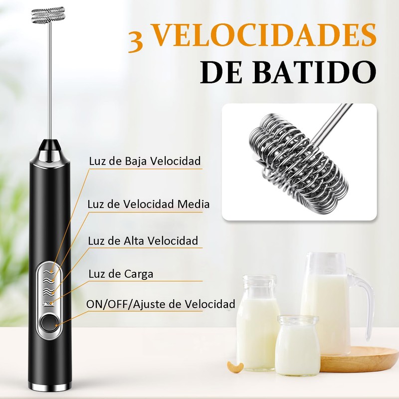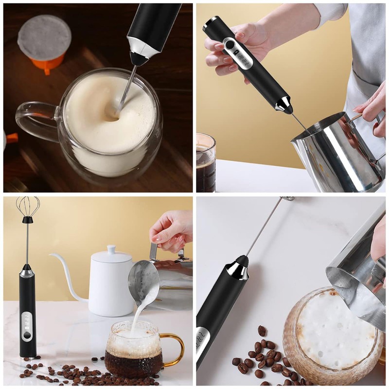 Ausein Espumador de Leche Electrico, Milk Frother Recargable de 3 en 1 por USB, 3 Velocidades Ajustables, Agitador de Cafe Portatil para Café, Latte Capuchino y Matcha, Facil de Lavar y Usar (Negro)