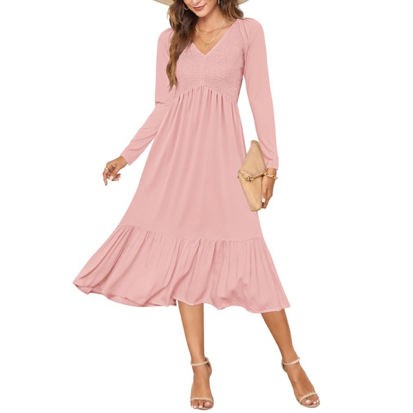 AUSELILY Women's Fall Empire Waist Dress 2025 Smocked Flutter Long Sleeve V Neck Flowy Tiered Midi Long Dresses, Light Pink XL