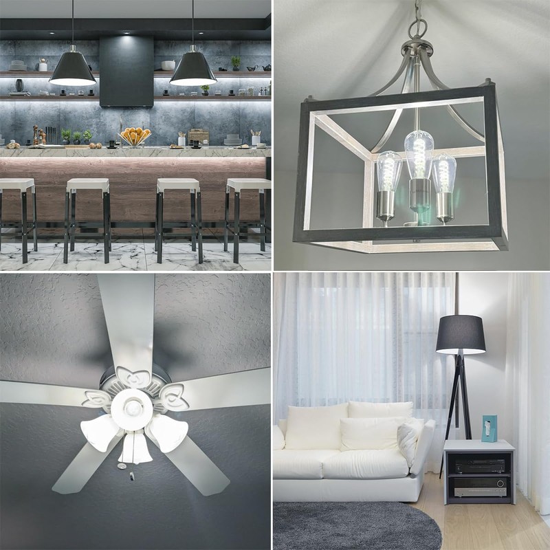 - 4. VERSATILE APPLICATIONS: Fit into E26 standard screw base and install into fixtures directly. Great suit for chandeliers, wall sconces, pendant lighting, home or commercial decoration, such as kitchen, dining room, living room, bedroom, laundry room, bar, coffee shop and restaurant.