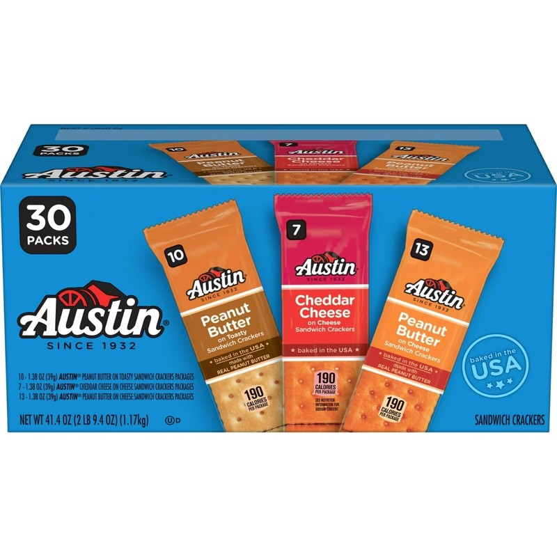 With three flavors oftasty sandwich crackers, this Austin sandwich crackers variety pack provides snackingsatisfaction for any occasion. When it's time for a salty, crunchy snack,choose Cheddar Cheese on Cheese sandwich crackers. If you've got a craving fora sweeter treat, reach for a pack of Peanut Butter on Toasty sandwich crackersor Peanut Butter on Cheese sandwich crackers. Our sandwich crackers areconveniently packaged to fit your busy lifestyle; it’s easier than ever to graba pack and go. Pack a snack for school, a well-deserved break at work, a longcommute, and other busy, on-the-go moments. Add some crackers to a partyplatter when guests are over, or just stash them in the pantry so they'realways available for a quick snack around the house. Their delicious tastehonors Austin’s three-generation tradition of excellence and quality ingredients.So, grab a pack and enjoy the sweet or salty taste no matter where you go.Shelf-Stable.