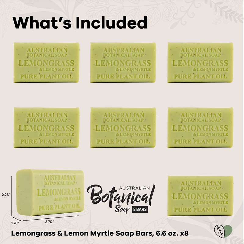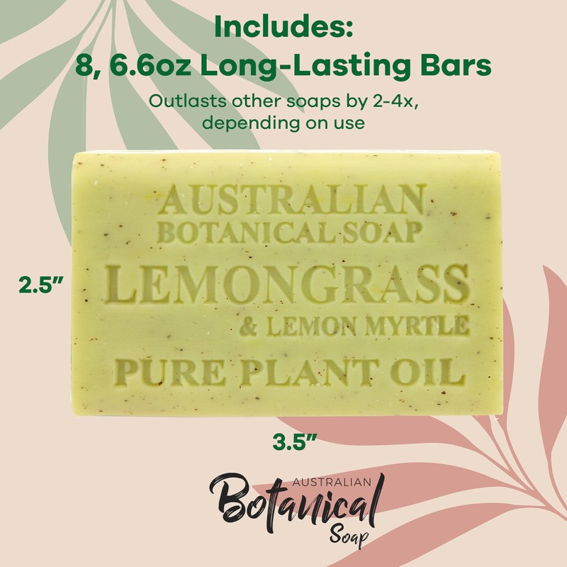 Australian Botanical Soap, 6.6 OZ, Lemongrass and Lemon Myrtle, Triple Milled Bars made with a Natural Soap Base and Enriched with Organic Shea Butter, Pack of 8