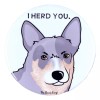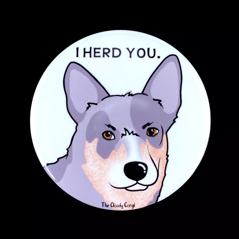- This cute, handmade button features a hand illustrated Blue Heeler / Australian Cattle dog upon a white background with the caption "I HERD YOU" in black text.