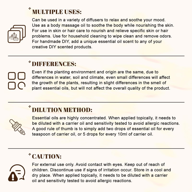- Precautions: For external use only, always dilute with carrier oil (such as coconut, jojoba oil) before use since it is highly concentrated. Discover the magic of essential oils for skin to moisturize and soothe skin, promote a healthy, glowing complexion