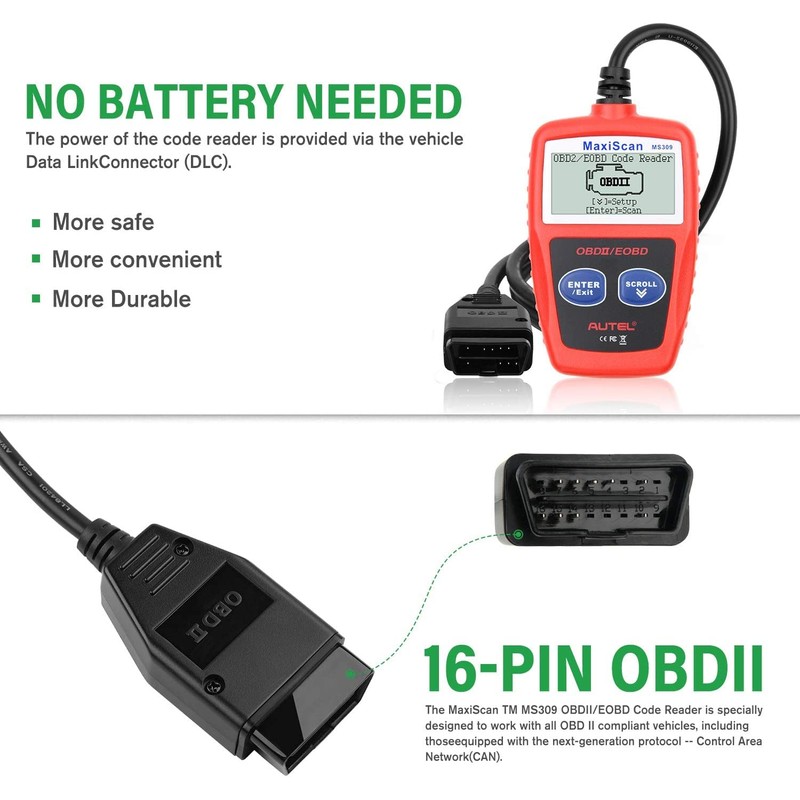 - 🚙【Wide Vehicle Compatibility】Autel MaxiScan MS309 compact pocket code reader supports all OBD2 protocols: KWP2000, ISO2000, ISO9141, J1850 VPW, J1850 PWM, and CAN. This OBD2 code scanner is compatible with all OBDII-Compliant vehicles, passenger cars, or light trucks. For OBD2 cars, usually, EU cars after 2006, Asian cars after 2009, US cars after 1996. 💥NOTE: It does NOT support ABS, Brake, SRS, full Engine systems, etc. If needed, pls consider ML629/ MK808BT or above.