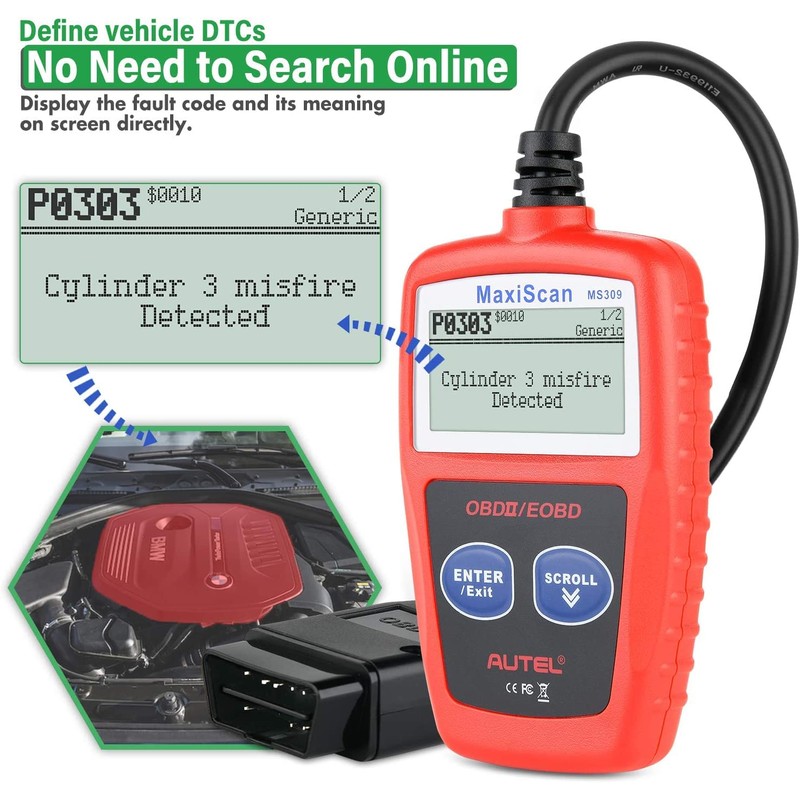- 🚙【Retrieve Vehicle Info & No-Risk Purchhase】This portable OBD2/EOBD scanner MS309 enables retrieval of the Vehicle Identification No. (VIN), Calibration ID(s), Calibration Verification Nos. (CVNs). This function is useful to check whether the ECU matches when you are buying a used car. 👨💼 It comes with 30 days return policy and1-year worry-free warranty. A very handy little tool to have with your bigger scanner. A must keep in your car. Contact info: 📧autelchoice@outlook.com📧.