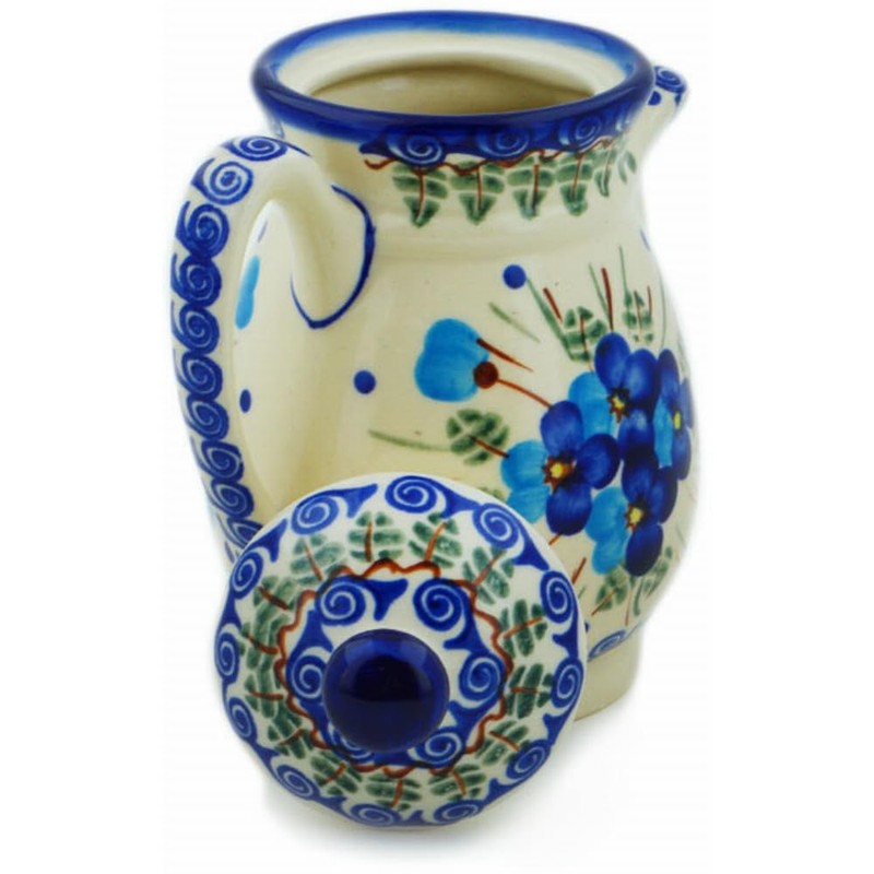 Authentic Polish Pottery Pitcher with Lid in Blue Pansy Design Handmade in Bolesławiec Poland by Ceramika Bona + Certificate of Authenticity