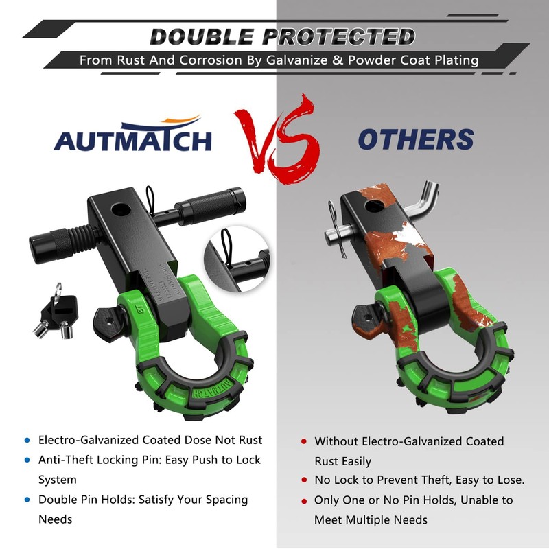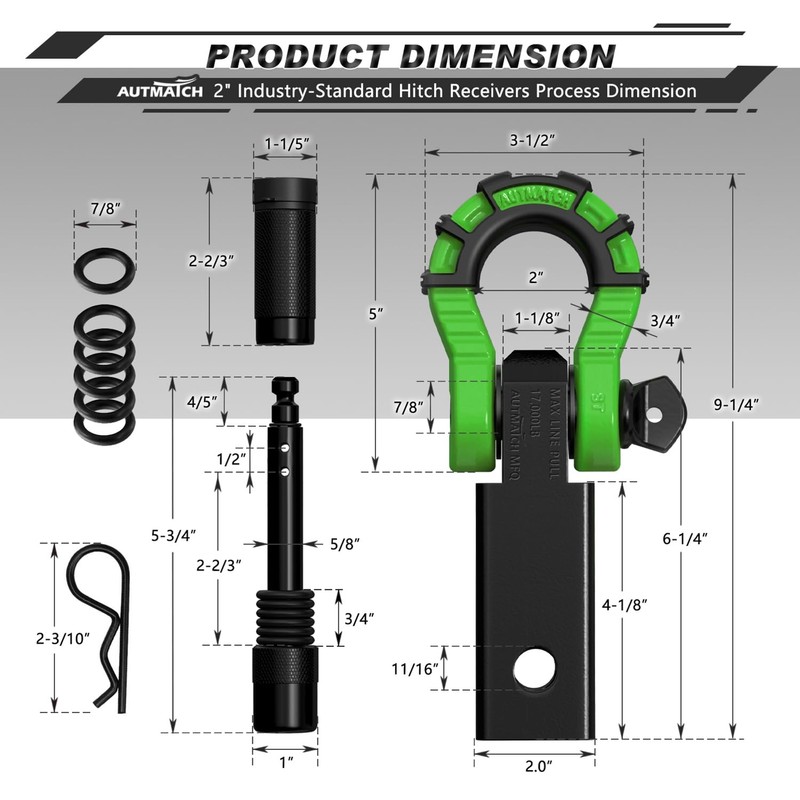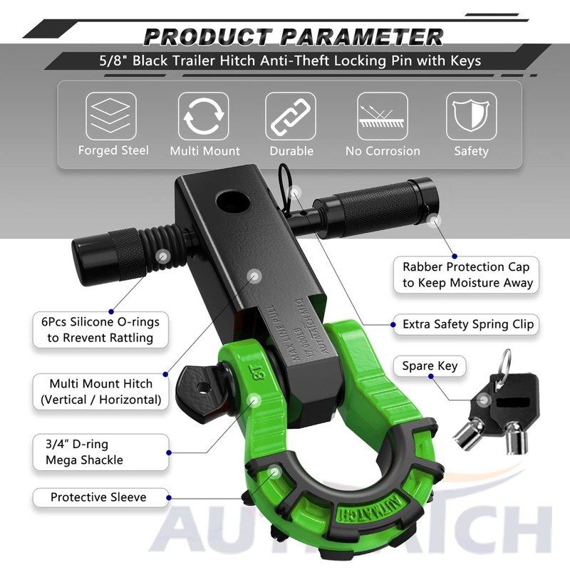 - Fitted Suite: 2" Shackle Hitch Receiver, Anti-Theft 5/8" Trailer Hitch Lock Pin, 3/4" D-ring Mega Shackle with Shackle Isolator & 4Pcs Washers kits, Protect The Bumper From Scratches and Prevent Rattling and Stolen