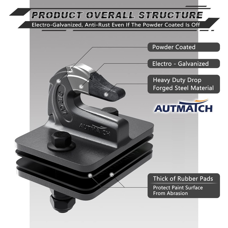 • Fitted Suite: Grade 70 Level 3/8" Tractor Grab Hook Bolt-on Mount with Backer Plate and Rubber Pad, 4Pcs of Grade 10.9 Lengthen Flange Bolts + Flat Washers + Hex Nuts + Spring Lock Washers + Metal Self-Locking Nuts, All the Hardware of Surface was Covered By Electro-Plating Black Protect