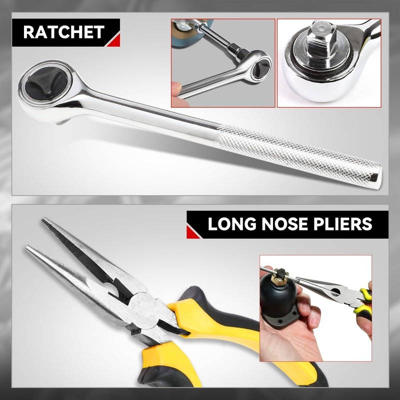 - 【Includes】1 Quick-Release 3/8" ratchet, 1 x 3" Extension Bar, 1/4" Sockets: 5mm, 6mm, 7mm, 8mm, 9mm, 10mm, 11mm, 3/16", 1/4", 9/32", 5/16", 11/32", 3/8", 7/16", 3/8" Sockets: 1/2", 9/16", 12mm, 14mm, 8 x Wrenches: 1/16", 5/64", 3/32", 1/8", 5/32", 3/16", 7/32", 1/4", 12oz Tubular Steel Hammer, 16 Hex Keys, 1 x Needle Nose Plier, 1 x Diagonal Cutter, 4 x Precision Screwdrivers, 4 in 1 Screwdriver, 1 x Utility Knife, 1 x 10' Measuring Tape, 1 x Fastener Assortment Case, 1 x Spark Plug Socket