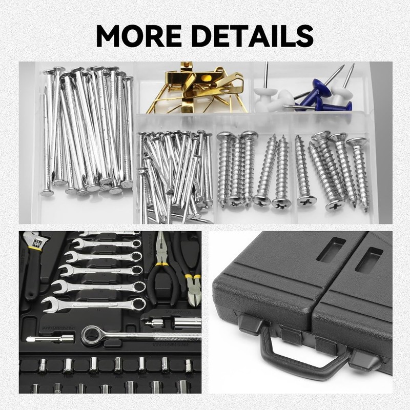 - 【Versatile】This versatile 160-piece mechanic's tool kit is designed for comprehensive utility, featuring an easily transportable case. It includes essential tools necessary to commence home maintenance, perform auto repairs, and undertake light-duty projects with efficiency and confidence. The set is meticulously curated to ensure readiness for a wide range of tasks, offering convenience and reliability in diverse work environments.